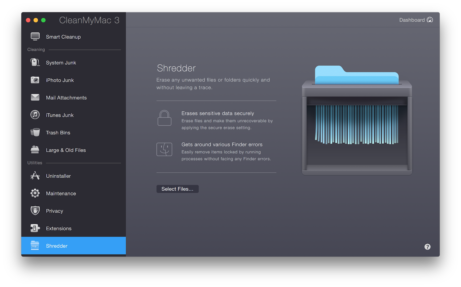 Измельчитель Не уверен, правда ли это, но MacPaw утверждает, что функция Shredder в CleanMyMac X удалит ненужные файлы безопасным или обычным способом, даже если Finder не может выполнить задачу.