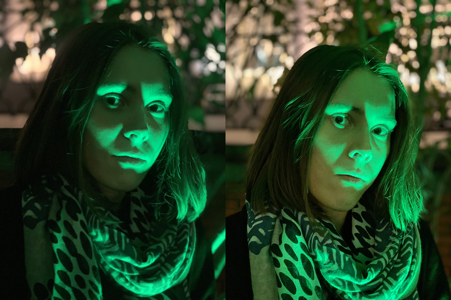 Посмотрите на волосы, которые освещены ярким цветным светом. iPhone XS превратил это место в цветное пятно, на фотографии справа видны детали.