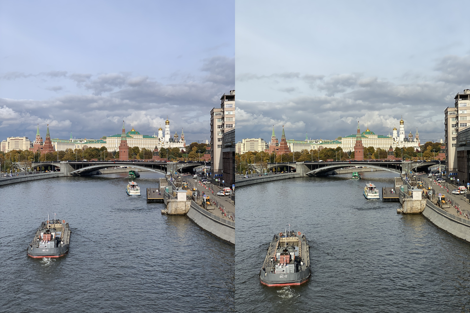 iPhone XS сделал все небо синим, дома, тоже синие, сливаются с фоном. На фотографии справа на небе заметны детали, видны облака, здания не сливаются с фоном.