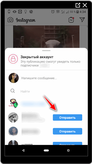 Второй способ, как отправить публикацию или поделиться снимком с друзьями в Личных сообщениях: нажать под постом «Поделиться». Под каждой публикаций размещена кнопка: «Отправить другу», нажав на которую – появится список «Лучших друзей» и тех, с кем были последние диалоги.