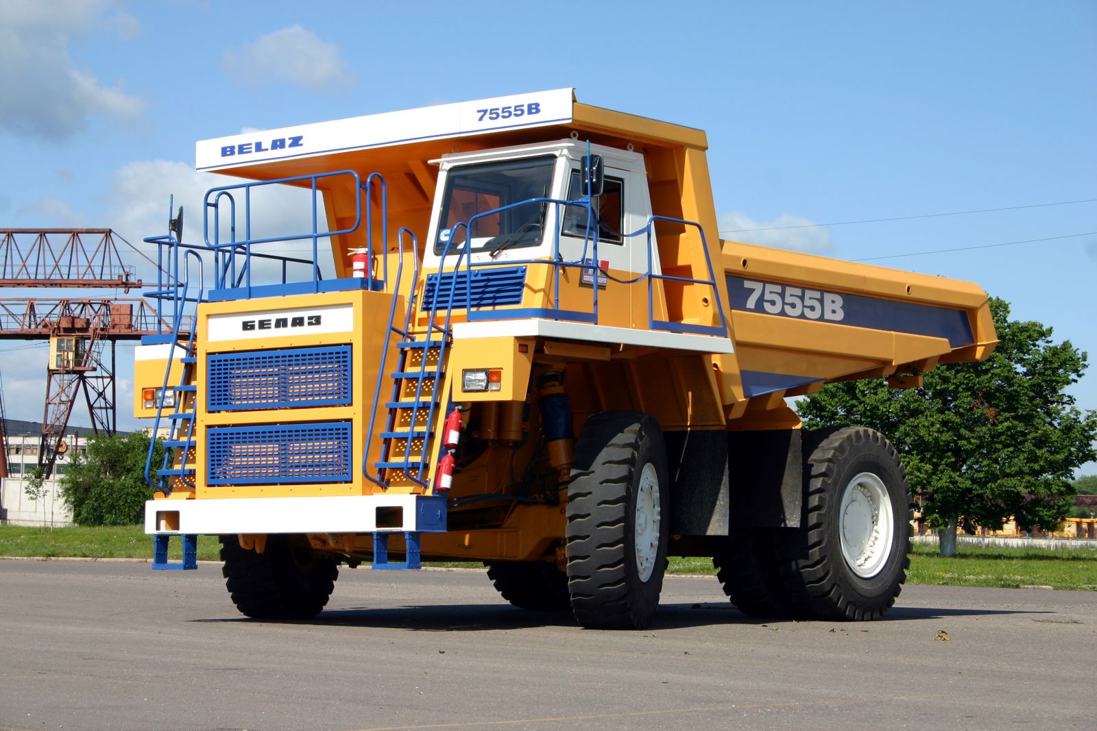 Самый «маленький» жодинский самосвал с электротрансмиссией, БелАЗ-7555, имеет грузоподъемность 55 т.