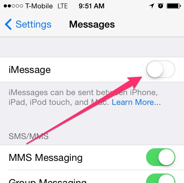 - Перейдите в «Настройки»> «Сообщения» и выключите iMessage.