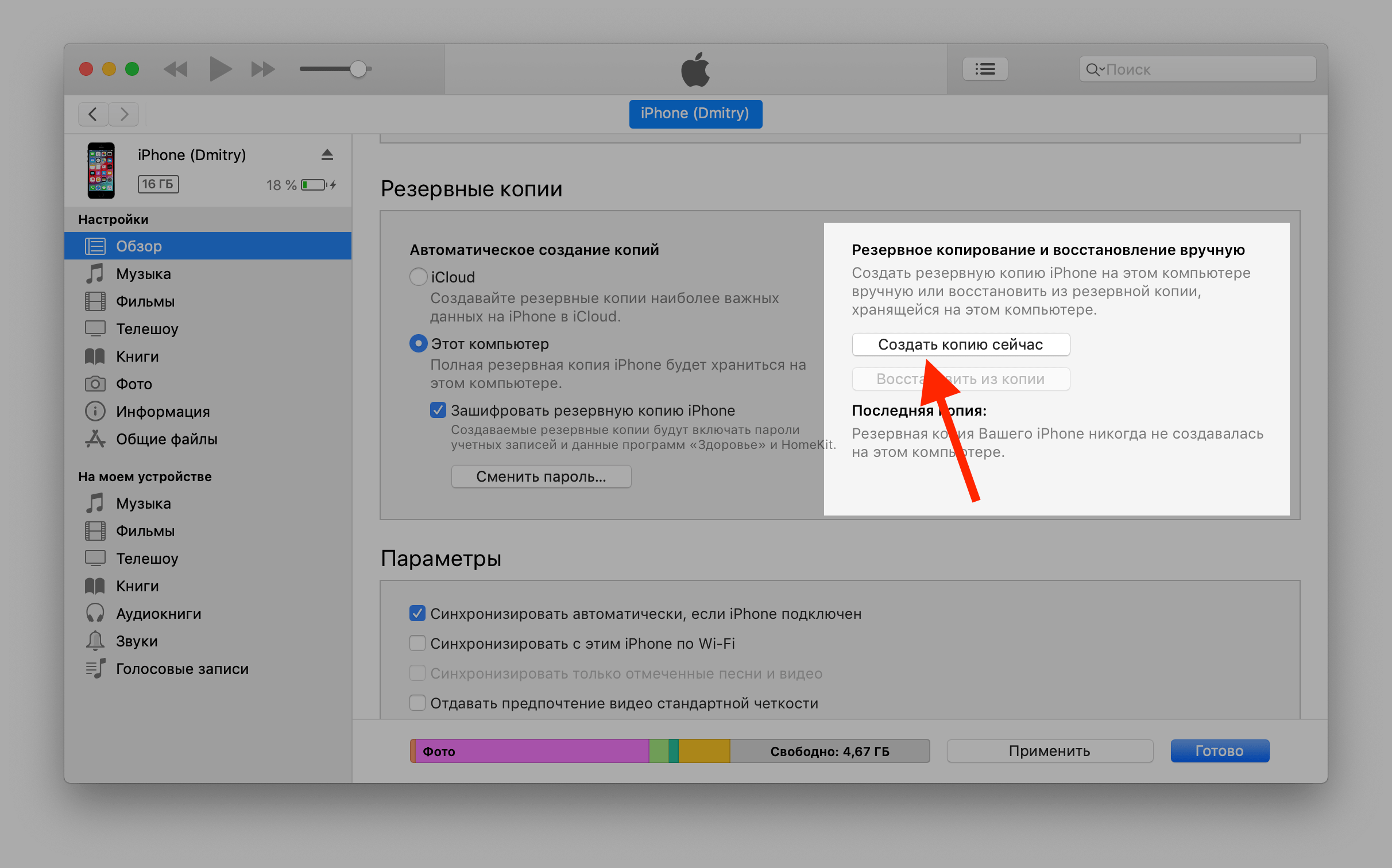 Чтобы сделать резервную копию «яблочного» устройства через нее, потребуется: