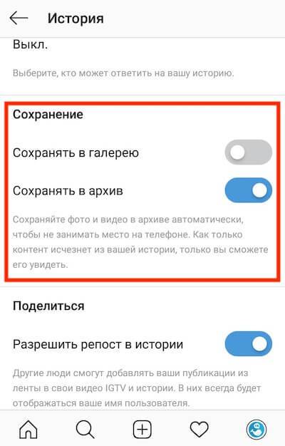 4. В элементах управления историей установите переключатель Сохранить в фотопленку (iOS) или Сохранить в галерею (Android) в положение ВКЛ.