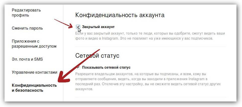 - Первым же пунктом находится настройка приватности. Если включить параметр «Закрытый аккаунт», то содержимое вашей страницы станет доступно только для подписчиков.