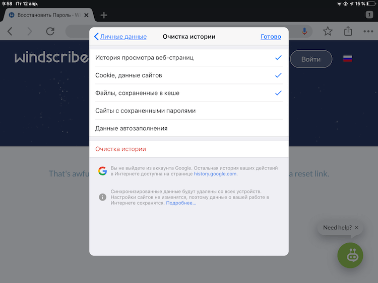 - Выберите «Очистить историю и данные». В этом случае удалится история просмотров, файлы cookie и другие данные просмотра.