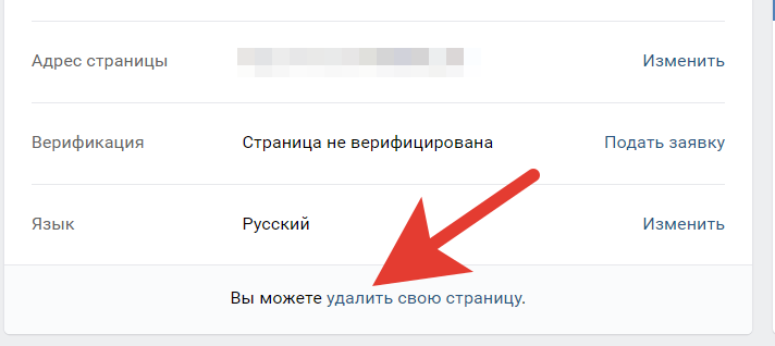 Для того, чтобы удалить страницу в полной версии, перейдите в настройки (в первой части статьи мы уже рассказали, как это сделать), и там, на основной странице настроек, найдите в самом низу ссылку «Вы можете удалить свою страницу». Щёлкните по ней.
