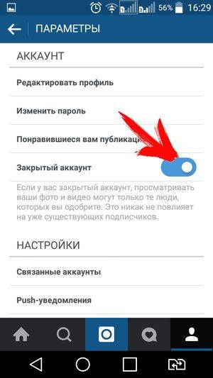 Чтобы открыть свой профиль в Инстаграм, снимите галочку с пункта “Закрытый аккаунт”.