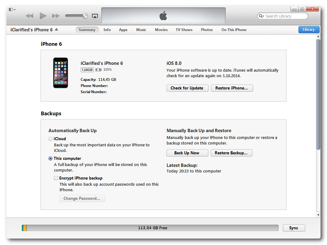 - iTunes синхронизируется с вашим устройством; сделайте резервную копию, следуя этому совету.