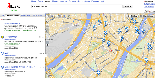 Для облегчения задачи «Яндекс.Карты» предлагают список заранее заданных категорий (отели, бары, автомойки и т.д.), с возможностью фильтрации результатов (для ресторанов, например, можно указывать тип кухни, выбирать только открытые в данный момент, предлагающие доставку еды на дом и т.п.). С недавних пор «Яндекс.Карты» получили поддержку офлайнового поиска, причем не только по конкретному адресу, но и по точкам интереса.