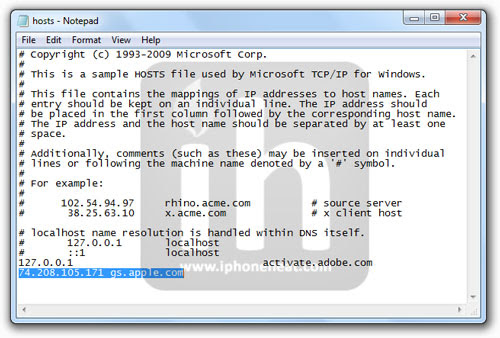 Скопируйте следующую строку — 74.208.105.171gs.apple.com. Вставьте его в хост-файл в качестве последней строки.