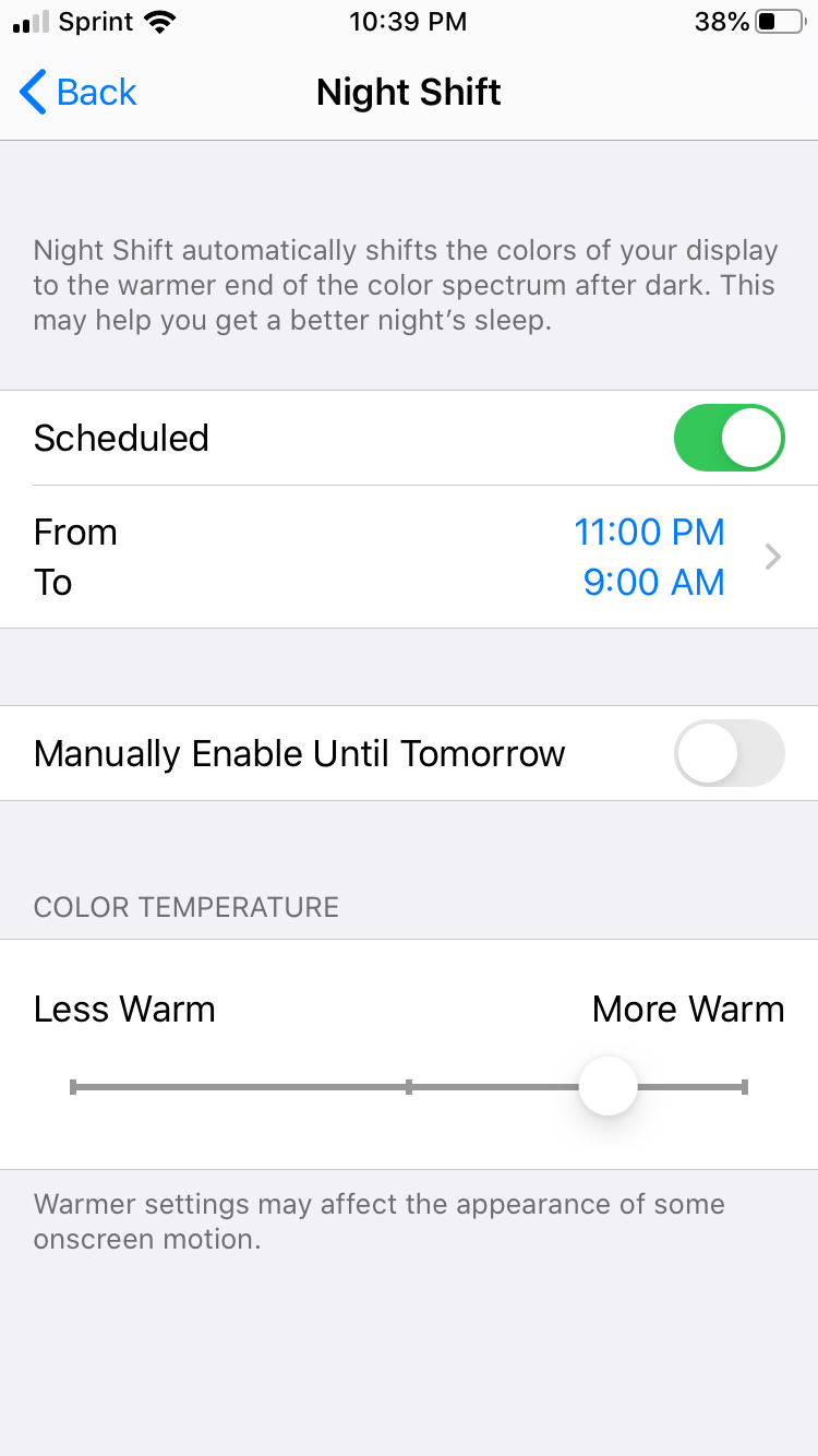 Функции вроде Night Shift, которые понижают цветовую температуру дисплея, на самом деле сбивают организм с толку, а не помогают ему успокоиться перед сном. Ведь когда речь заходит о попытках спастись от негативного влияния синего света куда более эффективным будет банальное понижение яркости дисплея, а окрашивание интерфейса в жёлтый цвет, напротив, заставляет глаза напрягаться, потому что синие оттенки более спокойны, а потому в меньшей степени воздействуют на зрачок.
