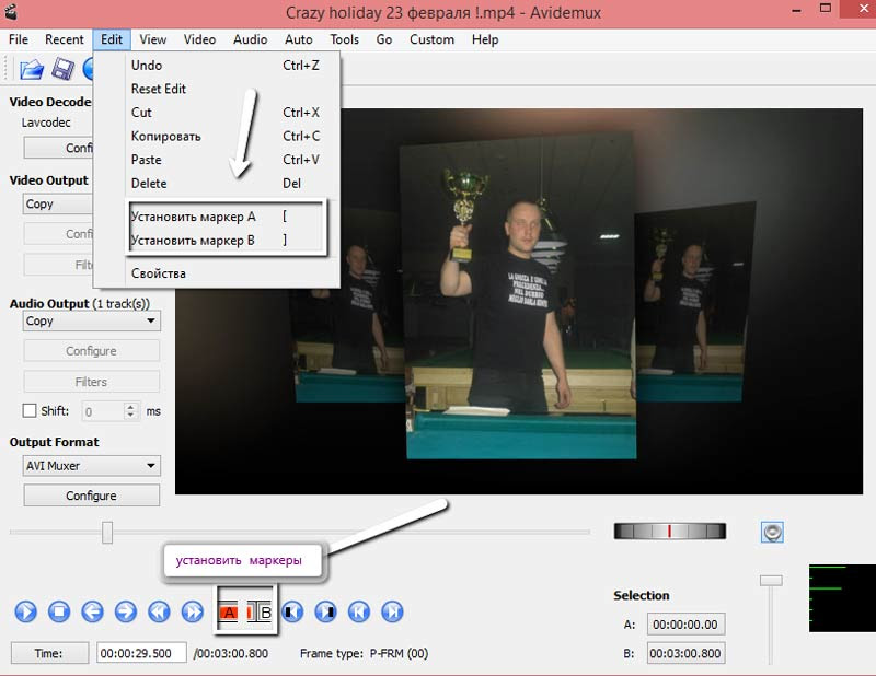 Откройте вкладку «Редактировать» – вы сразу попадёте в окно обрезки. Используйте чёрные треугольники, чтобы обозначить эпизод, который необходимо оставить. Левый маркер обозначает начало обрезки, а правый – конец. При необходимости, вы сможете обрезать запись с точностью до секунды, вручную заполнив строки на левой панели.