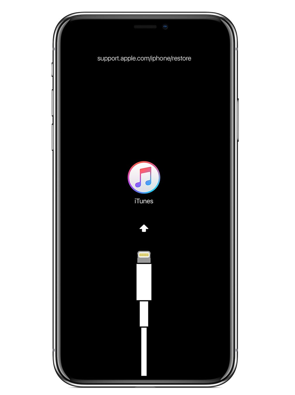 Ваш iPhone находится в режиме восстановления.Если вы не запустили iTunes, вы увидите знакомый экран USB-кабеля, указывающий на логотип iTunes, сигнализирующий о подключении iPhone к iTunes для начала восстановления.