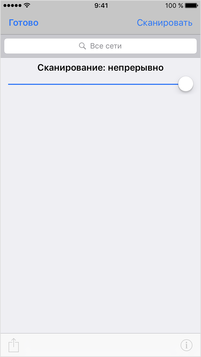 По умолчанию сканер Wi-Fi работает непрерывно. С помощью ползунка можно установить продолжительность сканирования до 60 секунд.