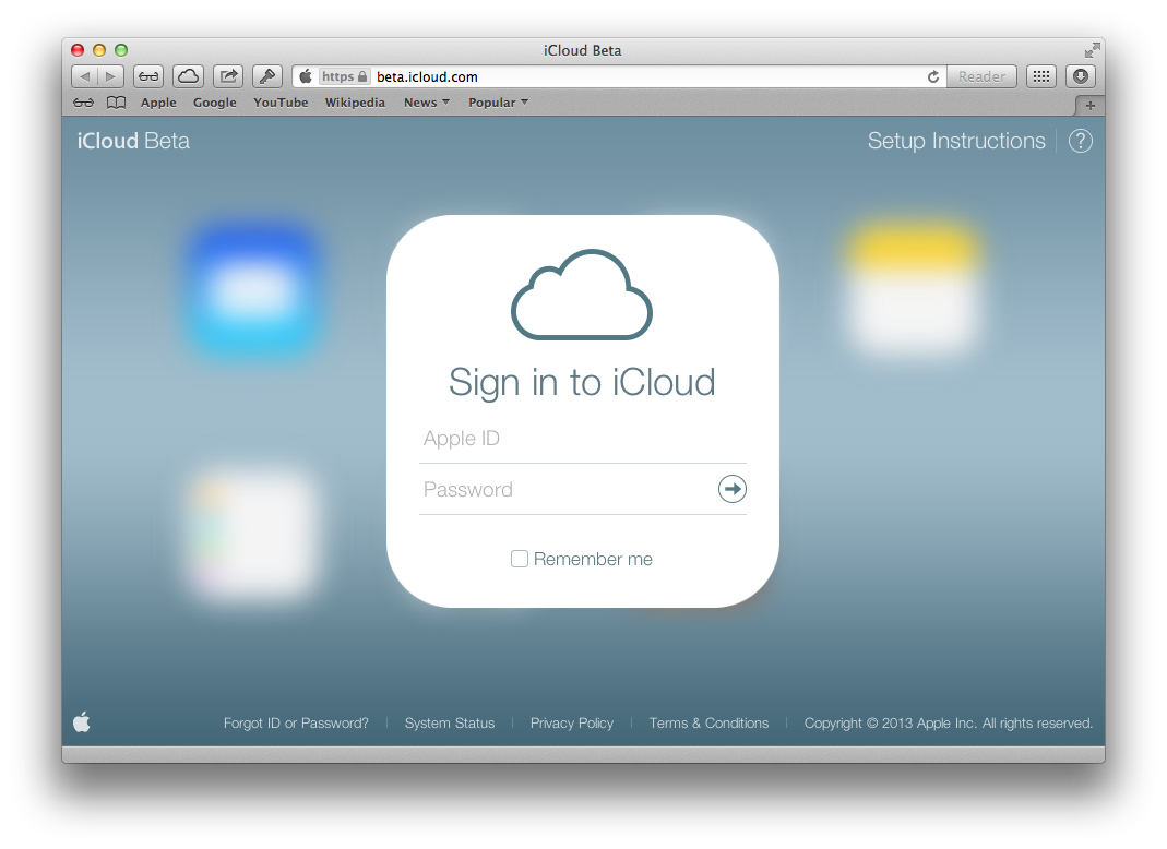 - В браузере перейдите на официальный сайт облачного хранилища айклауд и авторизуйтесь с помощью уникального идентификатора Apple.