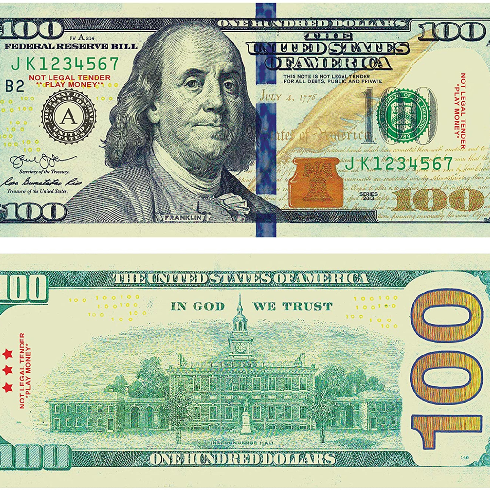 Счета также обычно называют «Бенджамины» в связи с использование портрета Бенджамина Франклина на купюре или «нот Си» на основе римская цифра 100.